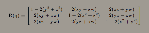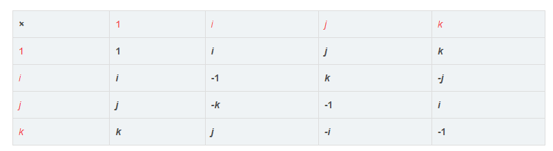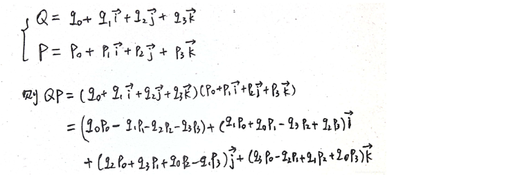 - 被旋转向量的四元数形式:qw = (0, wx, wy, wz) = 0 + wxi + wyj + wzk