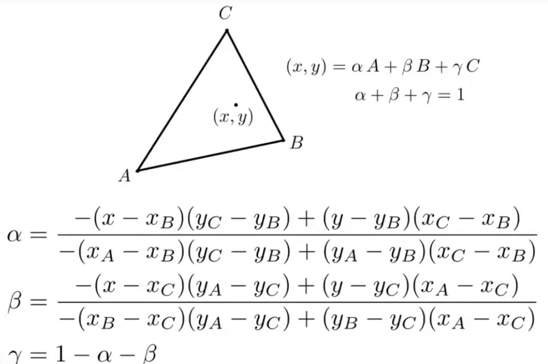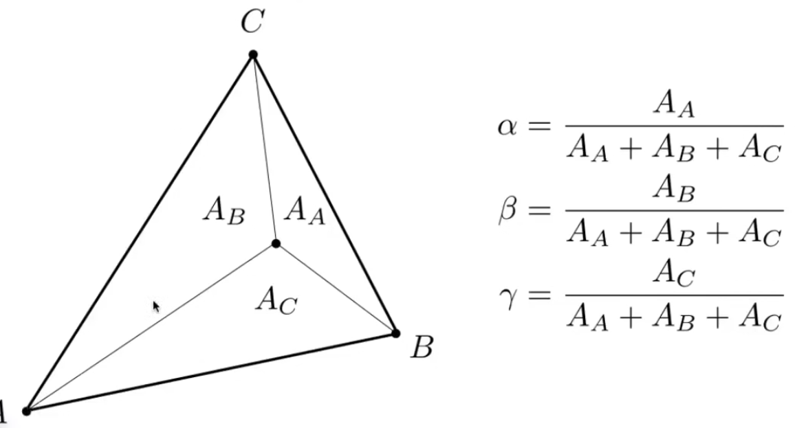- 重心插值:aA + bB + yC,ABC为顶点属性,a+b+y == 1,a、b、y>0(如果不是非负,在三角形所在平面内)
