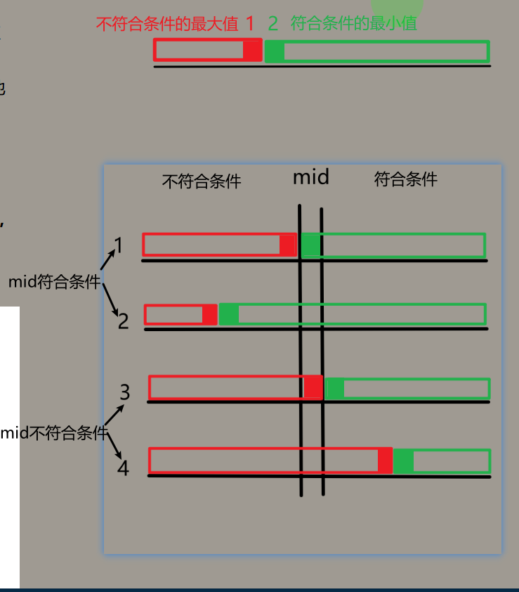 - 适用条件:对排序/部分排序数列, 找到符合条件的最小值/不符合条件的最大值 问题