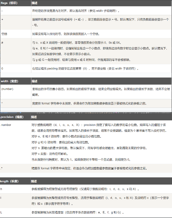 格式标签:%[flags][width][.precision][length][specifier],标识、宽度、精度、长度、格式字符