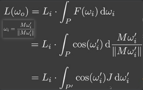 我们需要改写渲染方程,假设多边形光源任何radiance都是uinform一致的,因此作为常量可以提取到积分外,由于不考虑V项,积分内剩下F项和cos项组合一起,变为余弦函数,由于改变光源方向,M^-1*wi = wi`,即为M*wi`· = wi
